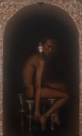It was in 2016 that he first began to execute his ideas in oil, after exclusively working out studies and sketches with graphite on paper. Receiving his first portrait commission the following year a solo exhibition ensued in march 2019, showcasing all works realized up until this point. In 2020 he began working in the atelier of an art restorer and conservator where he specialized on frame restoration and gilding, a practice he continues to carry out and apply to his own creative oeuvre.